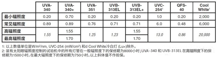 有太陽眼輻照度控制系統(tǒng)的設備可以設定輻照度水平。例如, 對于 UVA-340燈管, 設定0.89W/m2@340nm的輻照度和夏天正午時光強相當。為了更快地得到測試結果,紫外老化箱QUV可被設置在夏天正午光強200%條件下運行。基于不同燈管類型下表列出最高輻照度水平及一些常用的輻照度設置點。