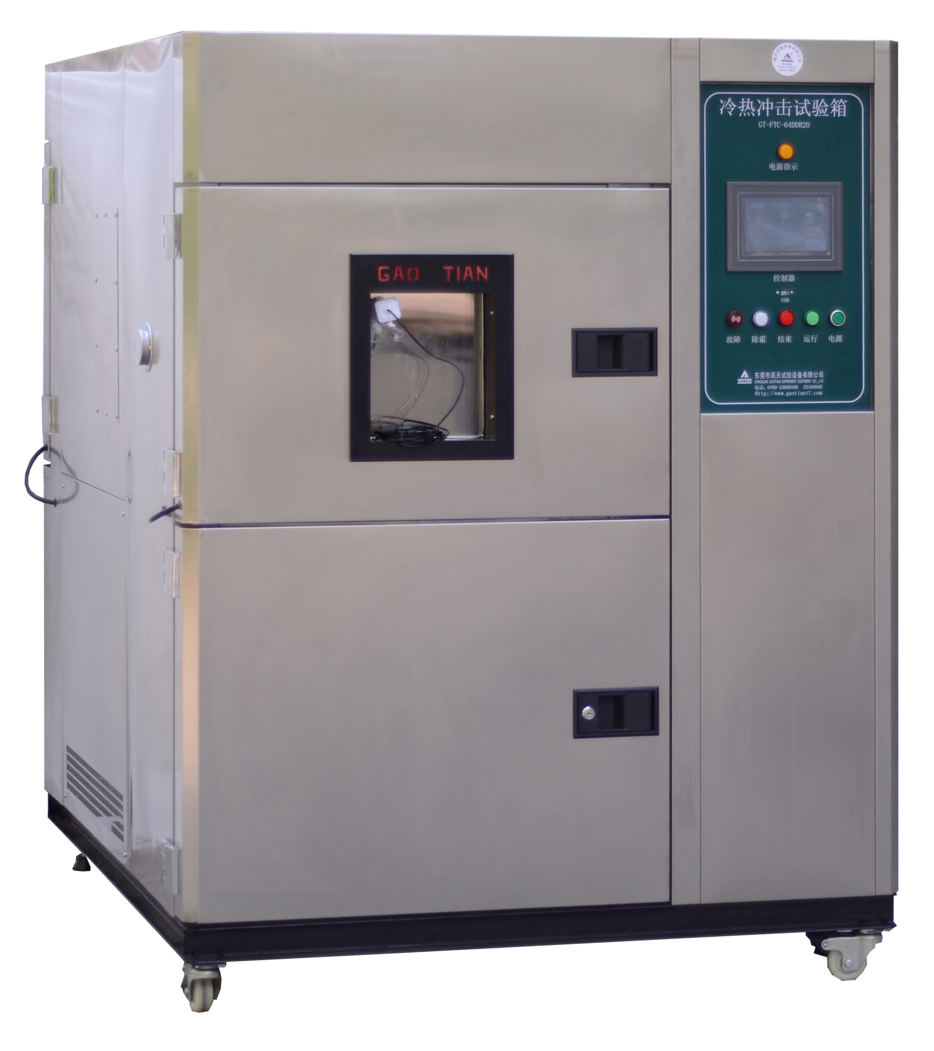 小型冷熱沖擊試驗箱 是利用低溫及高溫蓄冷熱槽,依動作打開閥門,將低溫及高溫通過送風系統(tǒng)快速快速送到試驗槽內,從而達到快速溫度沖擊效果,平衡調溫控制系統(tǒng)(BTC)+ 特殊設計之送風循環(huán)系統(tǒng),以P.I.D.方式控制SSR,使系統(tǒng)之加熱量等于熱損耗量,故能長期穩(wěn)定的使用.為了保證試驗箱降溫速率和zui低溫度的要求,本試驗箱采用一套進口法國?“泰康”全封閉壓縮機所組成的二元復疊式風冷制冷系統(tǒng)。復疊制冷系統(tǒng)包含一個高溫制冷循環(huán)和一個低溫制冷循環(huán);觸控式瑩幕直接按鍵型控制器,中文表示7.5”的圖形之廣視角,高對比附可調背光功能之大型LCD液晶顯示控制器。